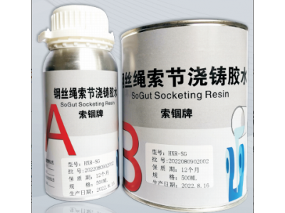 钢丝绳索节浇铸胶水(以下简称“钢丝绳胶水”)是一种用于钢丝绳索节浇铸的新产品,广泛应用于船舶和海上设施的系泊、拖带以及场馆、桥梁、起重、吊装等各个领域的钢丝绳索具制作。钢丝绳索节浇铸胶水可以在常温下浇铸、固化,避免了传统合金浇铸过程中加热温度过高而损伤钢丝绳的问题,提高了钢丝绳索节的使用安全性。钢丝绳胶水由A、B两组份组成,A组份为液体树脂,B组份为固体粉料。
